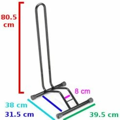 Ce support se met au sol et dispose de 4 bouchons en plastique ce qui préserve la surface du sol et évite au râtelier de glisser. Pesant 3 kilos, il a pour dimensions : 39.5 x 38 x 80.5 cm. L’espace pour accueillir la roue mesure 80 mm.